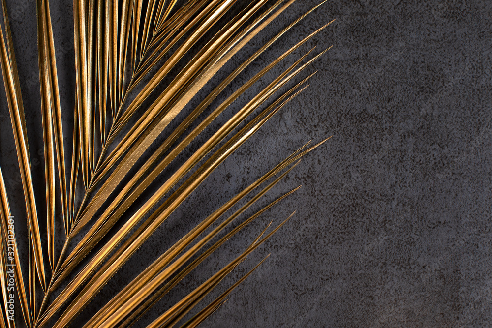 Closeup of golden palm leaf on abstract dark grey textured background. Tropical conceptual luxury elegant trendy art deco summer background. Flat lay. Open composition, copy space.
