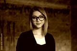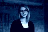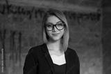 Woman smiling outdoors. Closeup portrait woman girl looking at you camera smile on face, black suit formal wear, eye glasses outside bricks wall grunge background