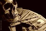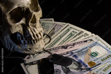 Skull with soldiers ' medallions on the background of American dollars. Concept: dead American soldiers, the price of victory, loss of breadwinner in the family, monetary compensation from the state.