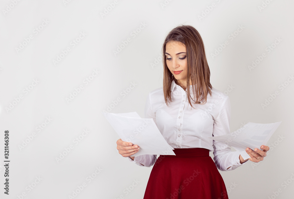 Young beautiful woman in a business clothes, reading some documents, paperwork. One single person isolated white wall background. Copy space.