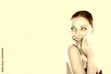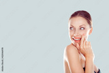Natural beauty laughing looking to copy space Closeup portrait smiling happy young woman beautiful girl looking side wards isolated light blue wall background Positive human emotion expression feeling