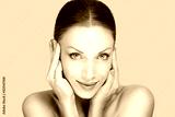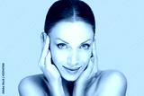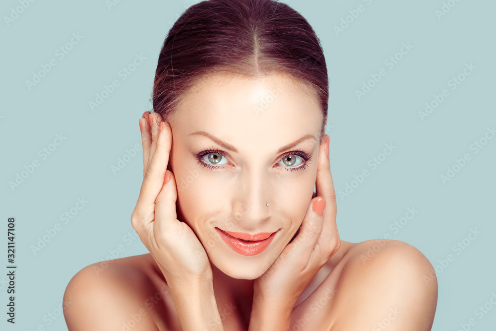Beauty light nude natural makeup skin looking at you camera slightly smiling. Beautiful face young adult woman with clean fresh skin hands around face isolated light green white background studio wall