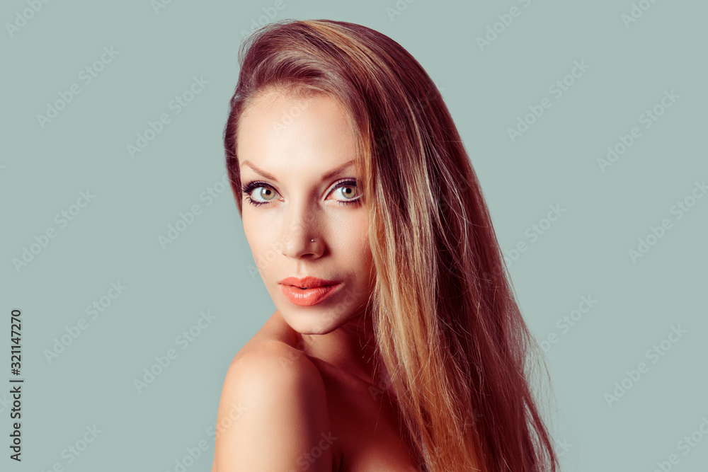 Sexy bold and beautiful. Girl beauty confident woman with natural color lips lipstick and makeup in a black dress with a naked shoulder, looking ahead white background long hair down green background