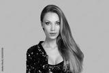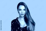 Brunette girl with long and shiny hair . Beautiful model with wavy hairstyle isolated blue background wall.
