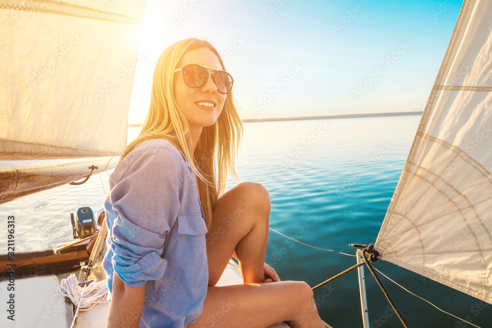 Young happy woman enjoying sunset from deck of sailing boat movi