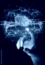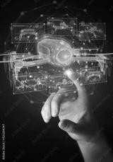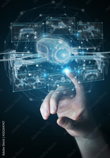 Businessman holding and touching holographic drone projection in his fingers 3D rendering