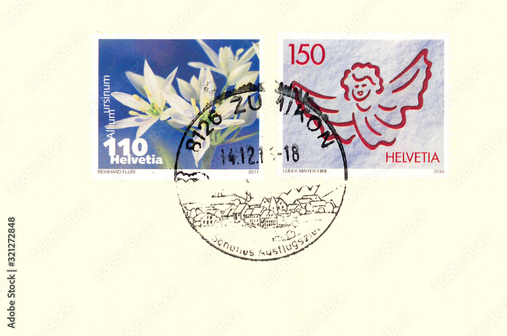 Briefmarke stamp Helvetia Schweiz Engel Blume flower Plant Pflanze Allium ursinum weiss white slogan Bärlauch Post