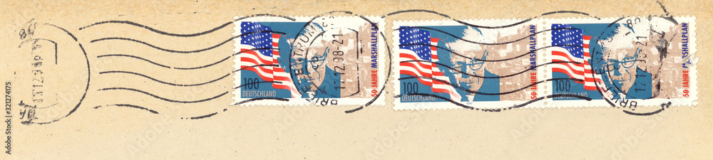 Briefmarke stamp Deutschland Germany 50 Jahre Marshallplan Amerika Flagge zerbombt flag US America 100 Gesicht Mann man drei 3 3er gestempelt used