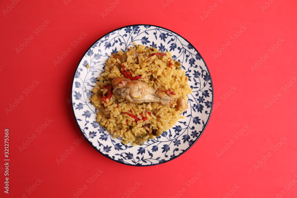 plate of rice with chicken and peppers