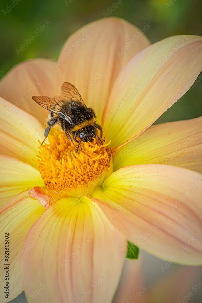 Close up image of a hairy bumble bee collecting pollen from a fresh pink and yellow dahlia flower. Sunny summer day in a garden. Green grass in background. Vertical image.
