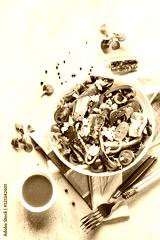 Vegetable salad cherry tomatoes, baked pepper, salad mix and onion with grilled haloumi (halloumi) cheese. Keto diet, healthy food. Light grey stone background. Top view.