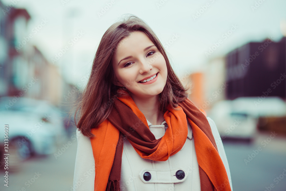 Happy and successful. Woman smiling outdoors blurred city on background in Brussels Belgium