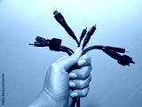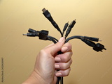 female hand with bunch of diferent network cables, wires with variety of ends to charge ohones / electronic devices