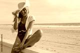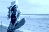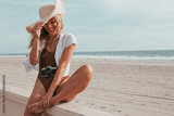 young woman sitting with a retro camera by the beach. california