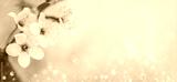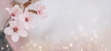 Closeup of cherry blossom flower on bokeh pastel background. Macro blooming orchard in spring.