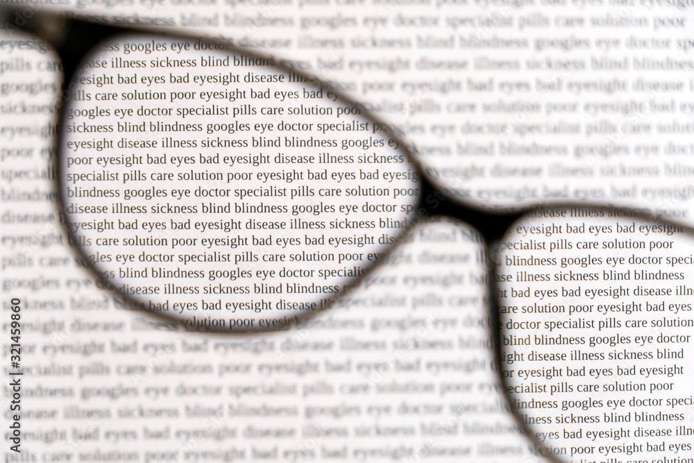 Unfocused black eyeglasses with view of sharp text through lenses. Bad eyesight concept. Eyecare concept. Reading concept. Health care concept.