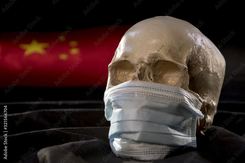 A human skull in a medical mask on the background of the Chinese flag. Concept: mortality in China from coronavirus, victims of medical experiments, epidemic and polluted atmosphere.