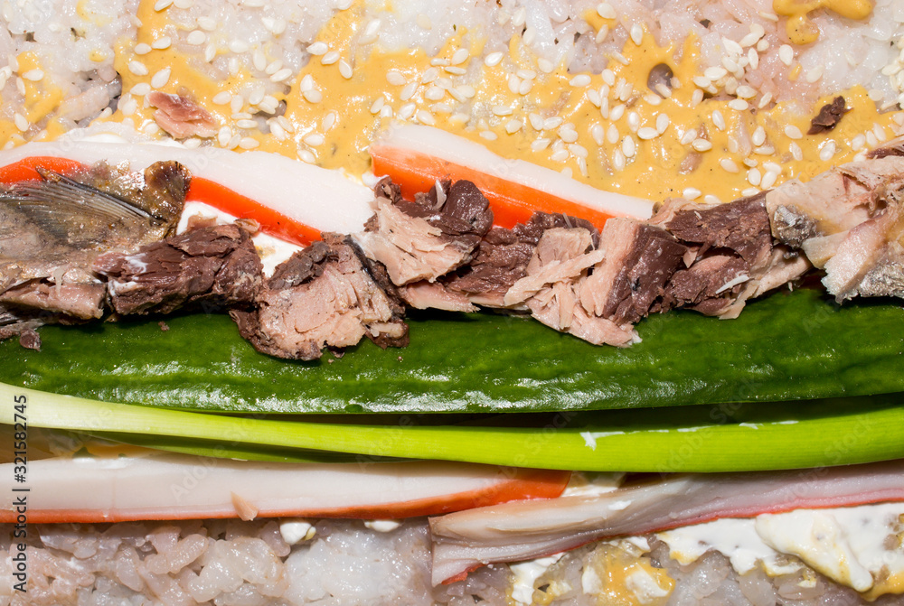 Sushi.Sushi in the open form.Sushi preparation.Homemade sushi.Sushi background.