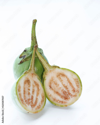 fresh short eggplant vegetable on white isolated background.