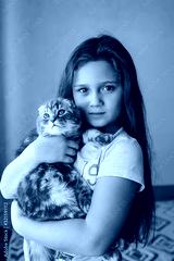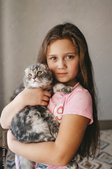 Beautiful causiasian girl hug scottish fold kitten at home. Pet animal concept.