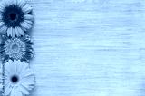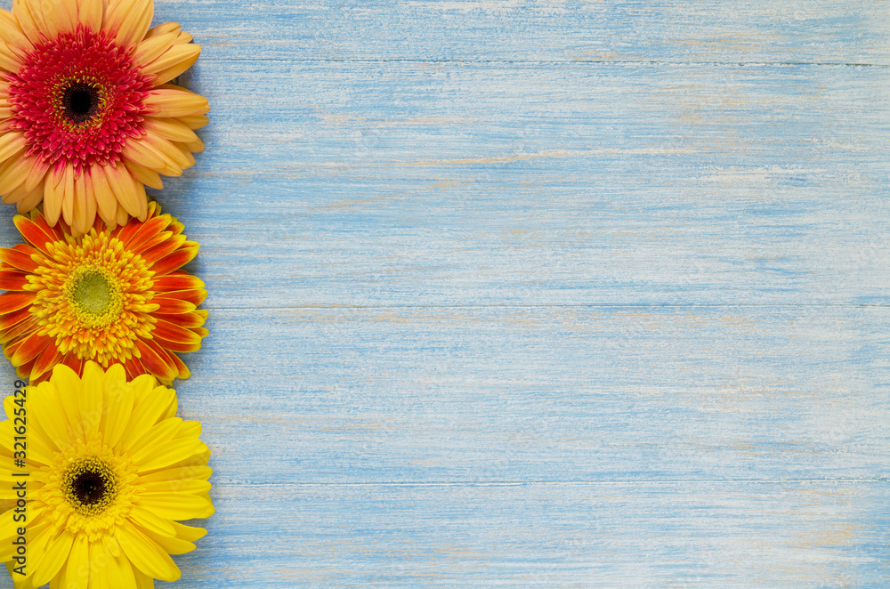Yellow and red gerbera flowers on vintage blue wooden background, border design, copy space