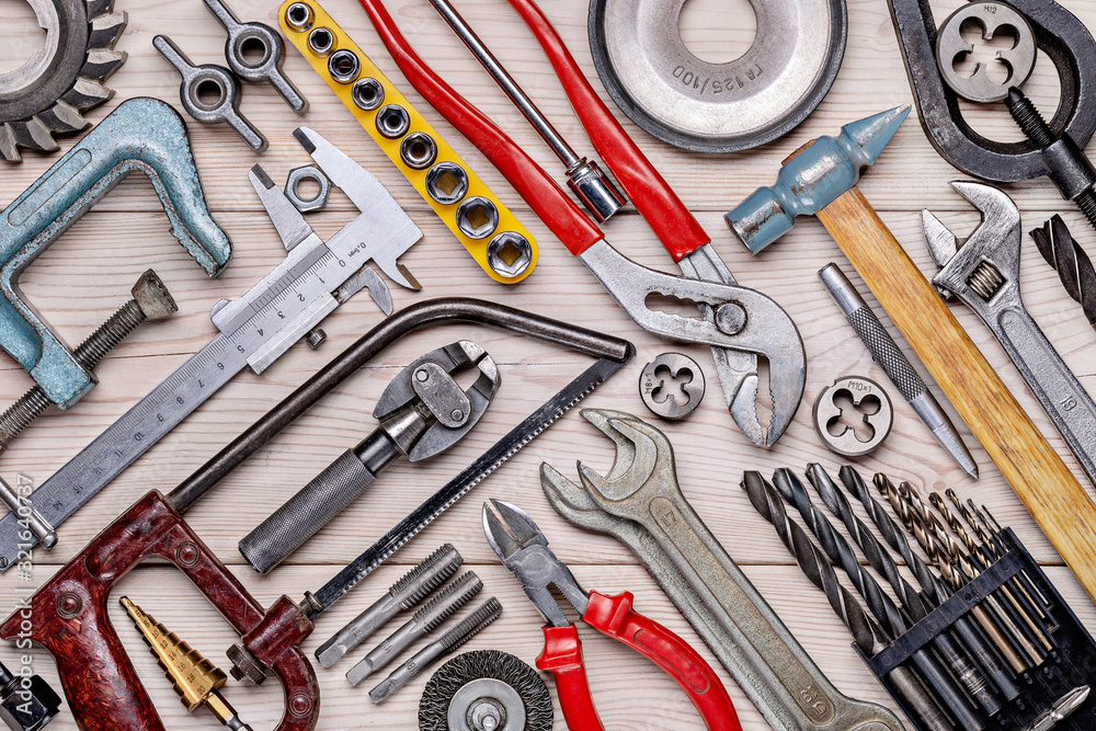Set of various home tools lying in a row on a wooden background. Men's style. Studio shot.