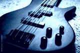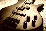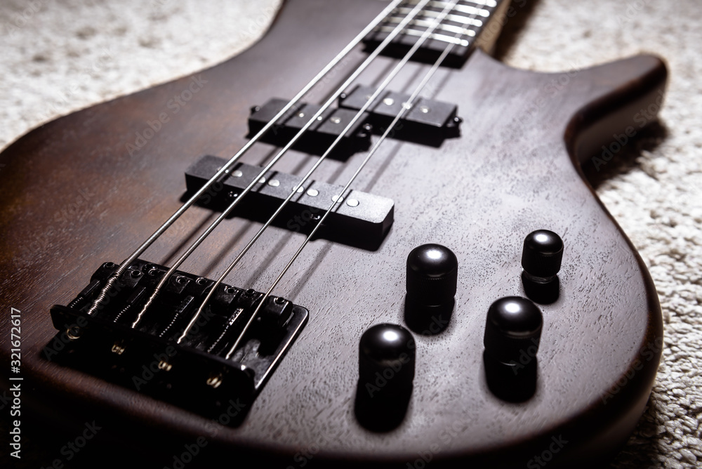 Bass guitar with four strings closeup. Detail of popular rock musical instrument. Close view of brown electric bass, selective focus.