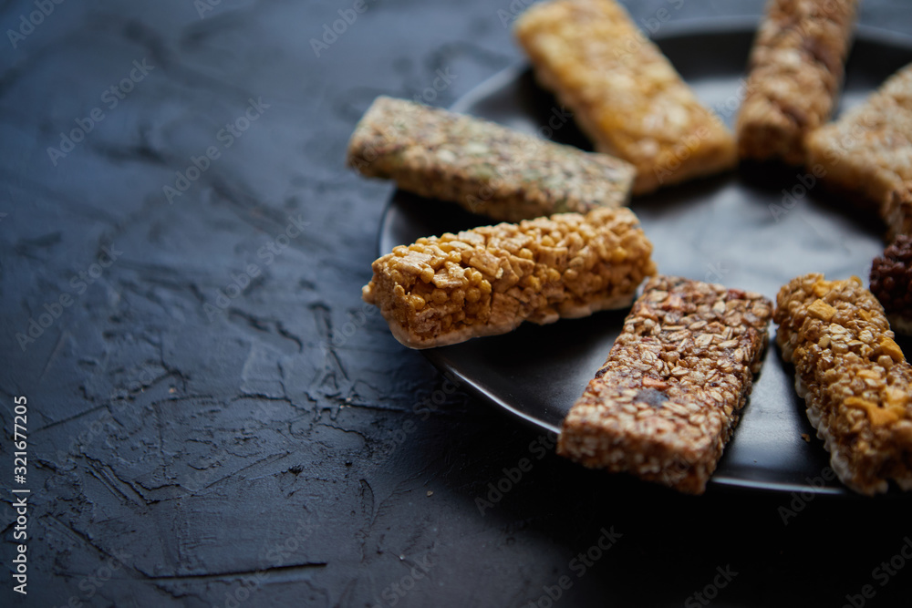 Different kind of granola fitness bars placed on black ceramic plate on a table