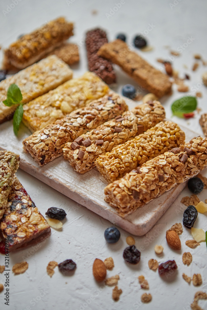 Homemade gluten free granola bars with mixed nuts, seeds, dried fruits
