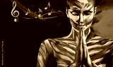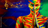 Color art face and body painting for inspiration. Woman in namaste yoga asana listen music. Closeup portrait of the bright beautiful girl with colorful make-up and bodyart and music notes.