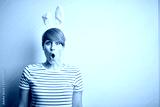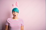 Young woman with fashion blue hair wearing easter rabbit ears over pink background afraid and shocked with surprise expression, fear and excited face.