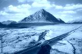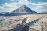 Road trip at Buachaille Etive Mor aerial view during summer season moor highlands landscape and A82 road bridge at Glencoe Scotland