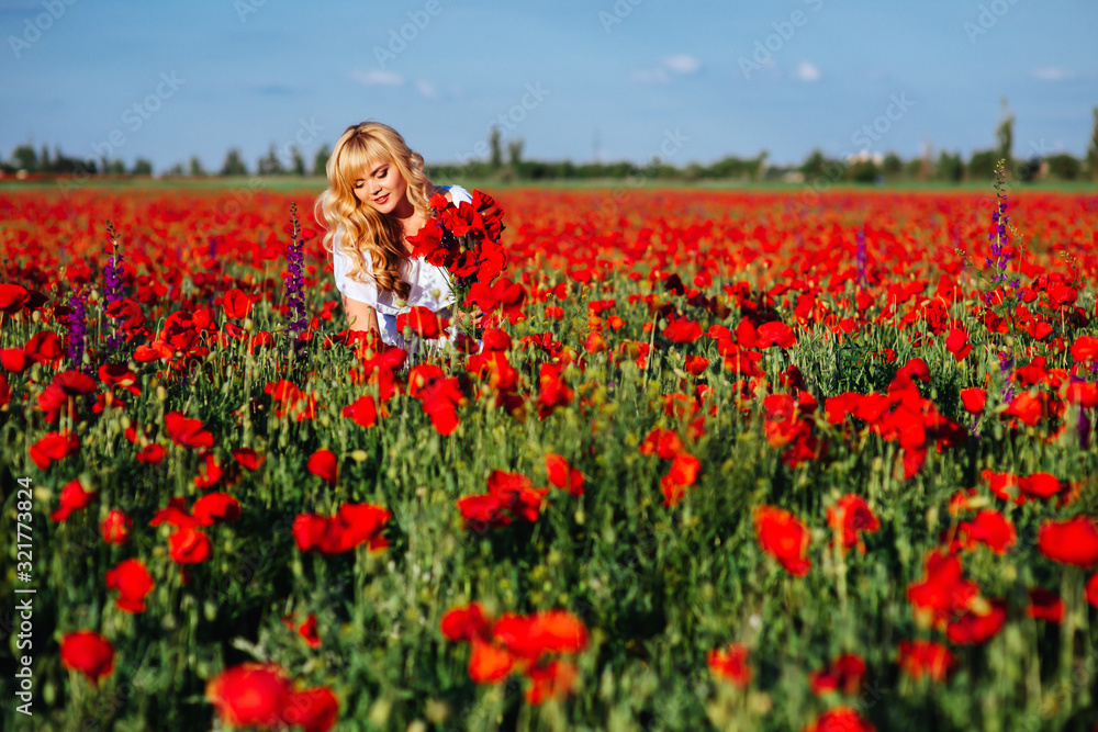 cheerful girl with curly blond hair in a huge poppy field alone, springtime, sunset