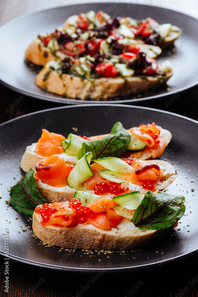 Italian Appetizer Bruschetta with roasted tomatoes, mozzarella cheese, garlic and herbs on wooden table
