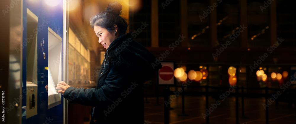asain female woman traveller withdrawing money from credit card at ATM nighttime with light bokeh background financial ideas concept