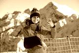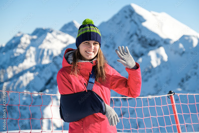 Young woman with her damaged right arm after snowboarding
