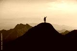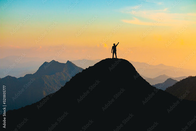The silhouette of a man with a cheerful raise in his hand on the top of the mountain During sunset time The concept of effort and success