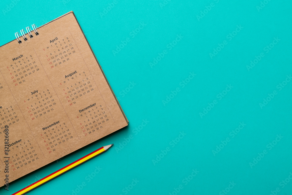 close up of calendar on the green table, planning for business meeting or travel planning concept