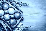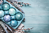 Happy Easter. Congratulatory easter background. Easter eggs and flowers. Background with copy space. Selective focus. Top view.