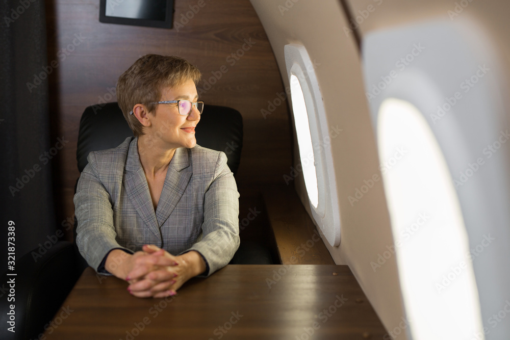 adult woman with a short haircut in a suit sitting in a private jet seat