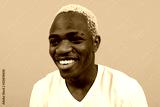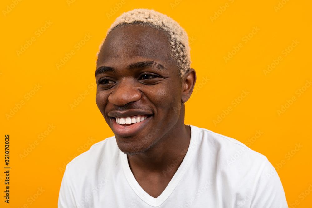 portrait of a smiling handsome black blond african man close-up on an orange background