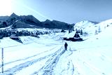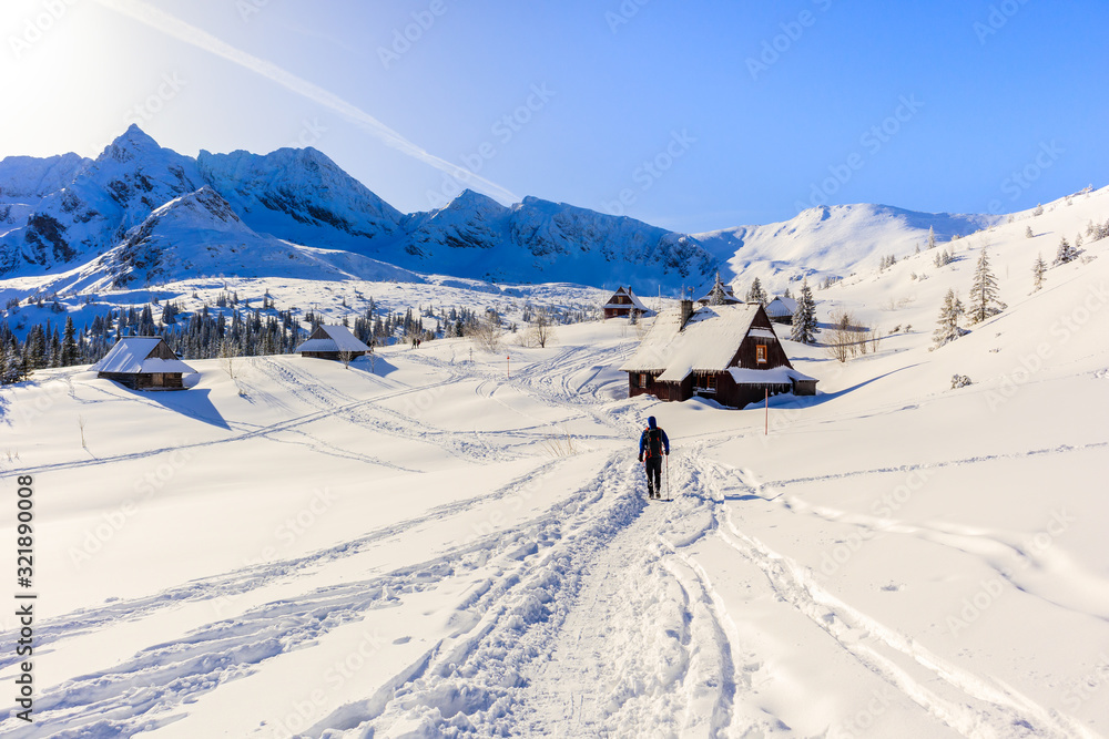Tourist backpacker walking in beautiful Gasienicowa valley in winter time, Tatra Mountains, Poland