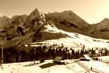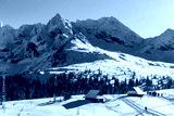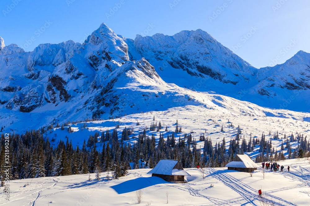 Old wooden mountain huts in beautiful winter landscape of Gasienicowa valley, Tatra Mountains, Poland