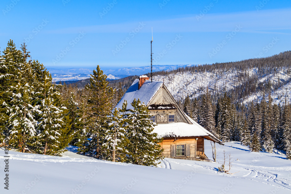 Old wooden mountain hut in beautiful winter landscape of Gasienicowa valley, Tatra Mountains, Poland