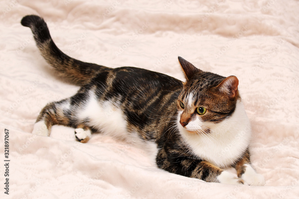 A motley cat lying on a white blanket