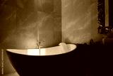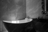 Stone bath tub in luxury interior hotel with sun light from top. Organic spa relaxation in Bali bathroom.