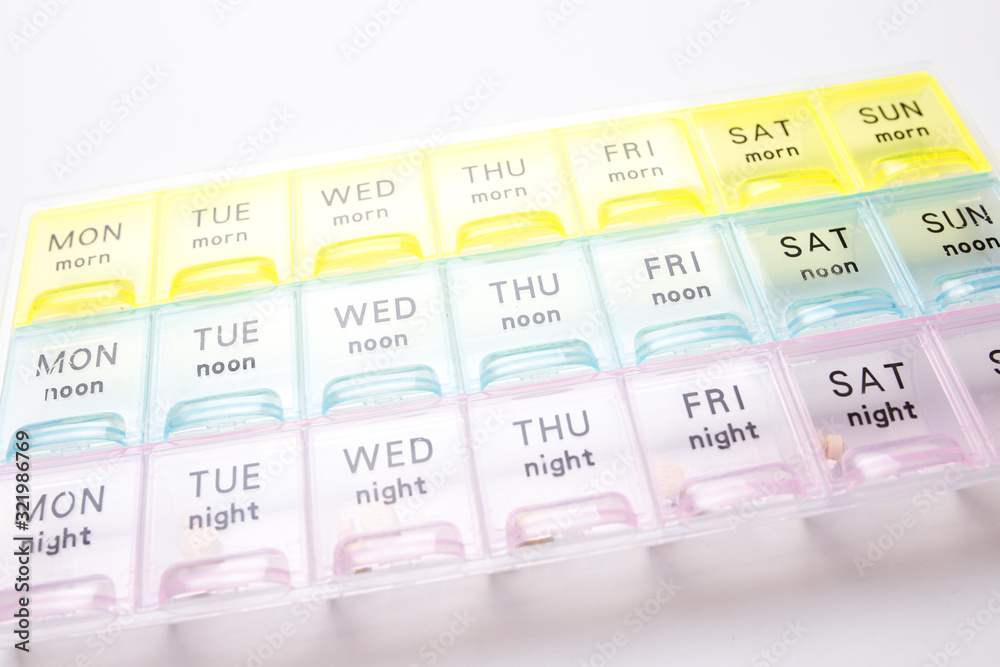 Organizer for medical pills on a white isolated background close-up. Organization of taking pills of the day.