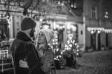Outdoor night portrait of young happy hugging couple, model looking at each other, posing in street of European city. Copy, empty space for text