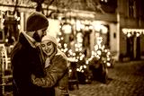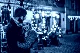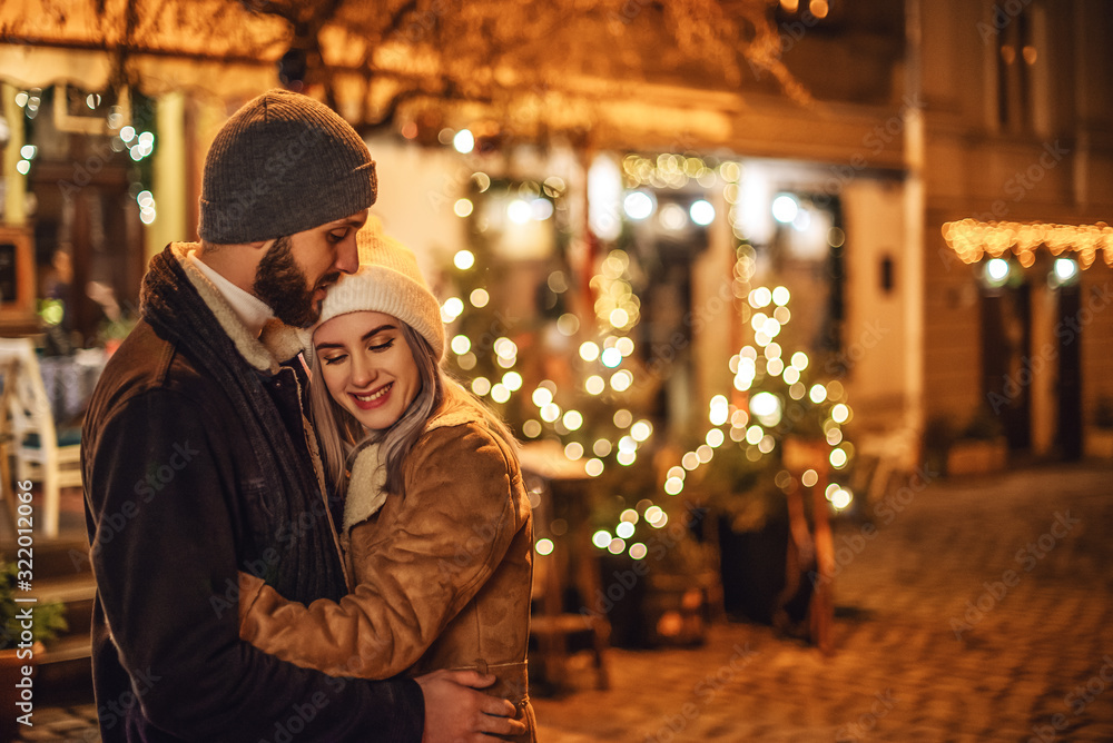Outdoor night portrait of young happy hugging couple posing in street of European city. Copy, empty space for text