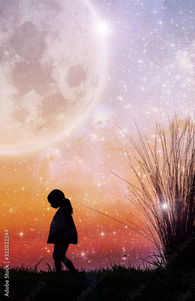 Fantasy book cover template - Little girl silhouette and beach grass at sunset with stars and huge planet in the sky. Elements of this image are furnished by NASA
